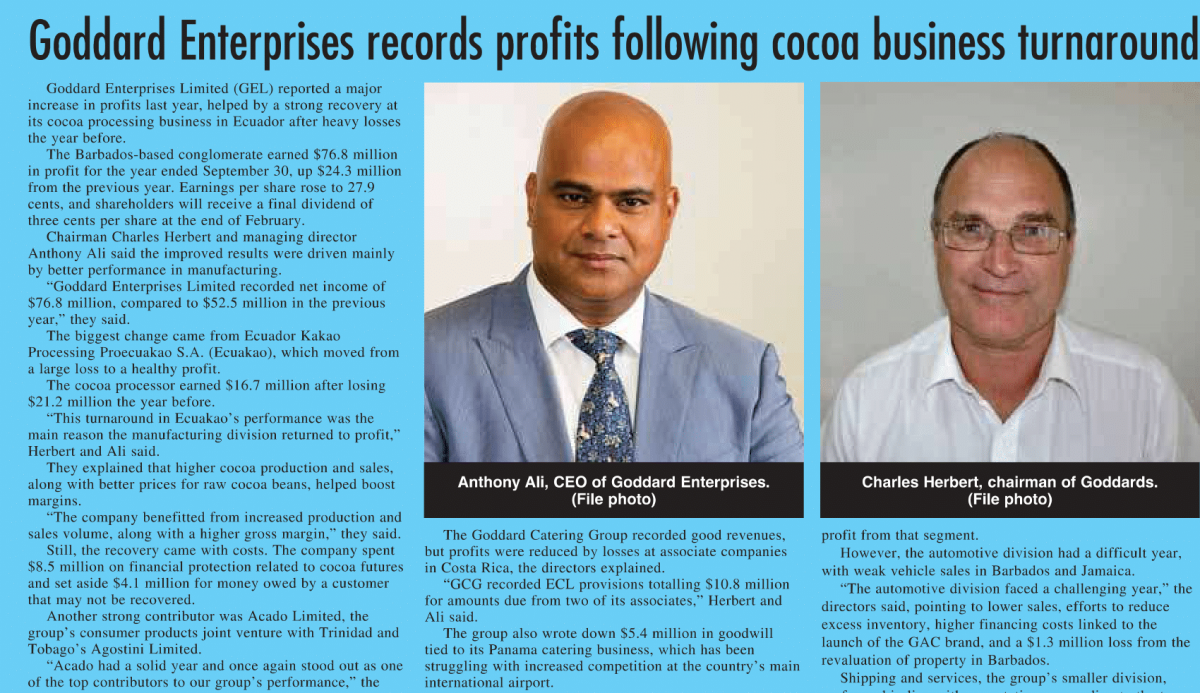 Categories NewArticles Goddard Enterprises records profits following cocoa business turnaround Post author By godardadmin Post date December 30, 2025 Goddard Enterprises records profits following cocoa business turnaround ← Cocoa fix boosts GEL earnings → Shareholder Notice-Availability of GEL’s 2025 Annual Report-31 December 2025